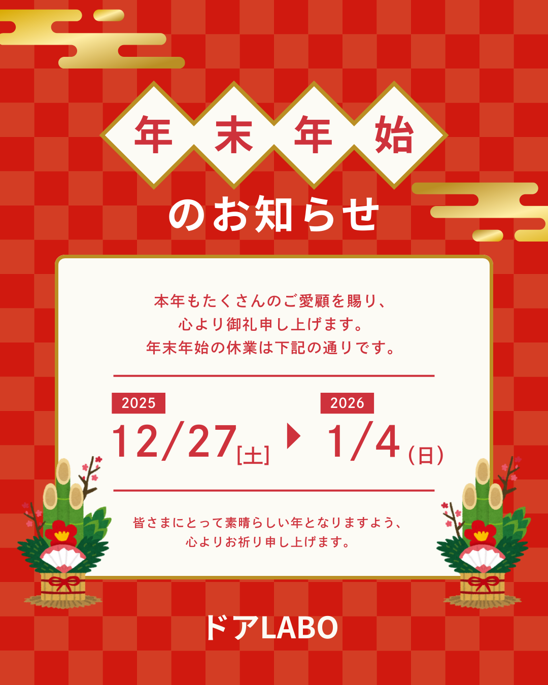 誠に勝手ながら、2025年12月27日(火)~2026年1月4日(日)を年末年始の休業日とさせていただきます。